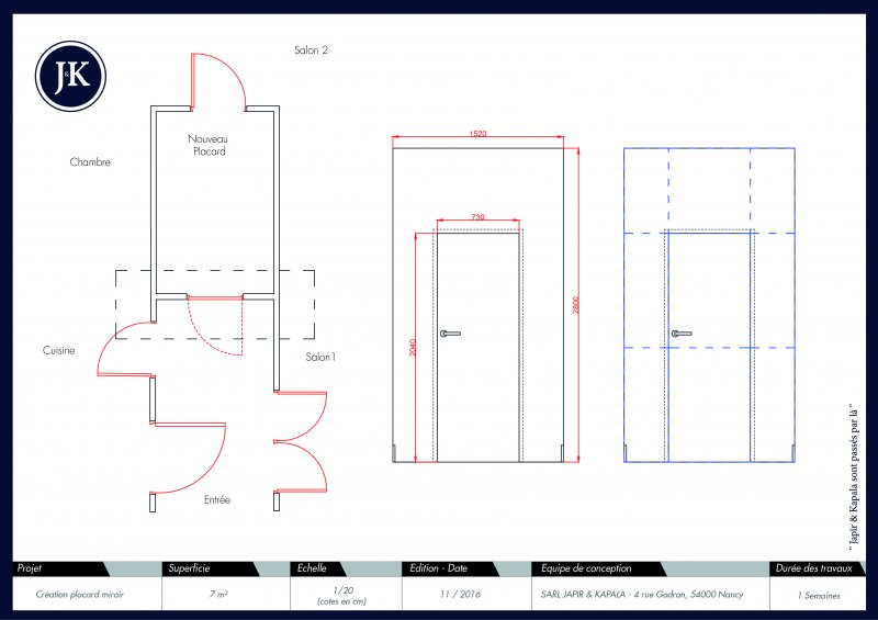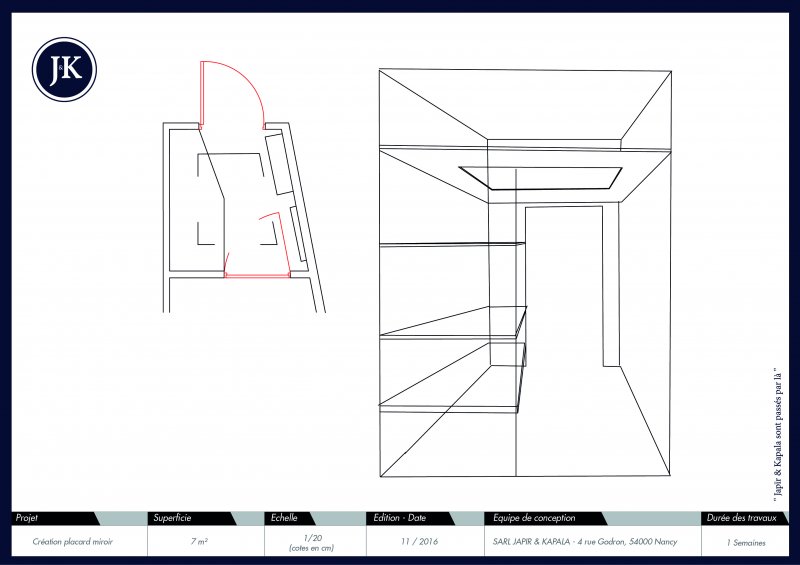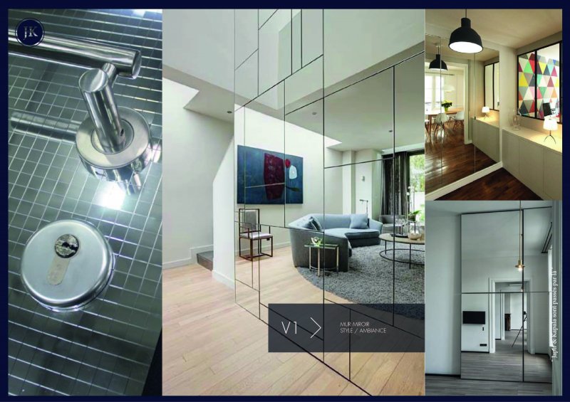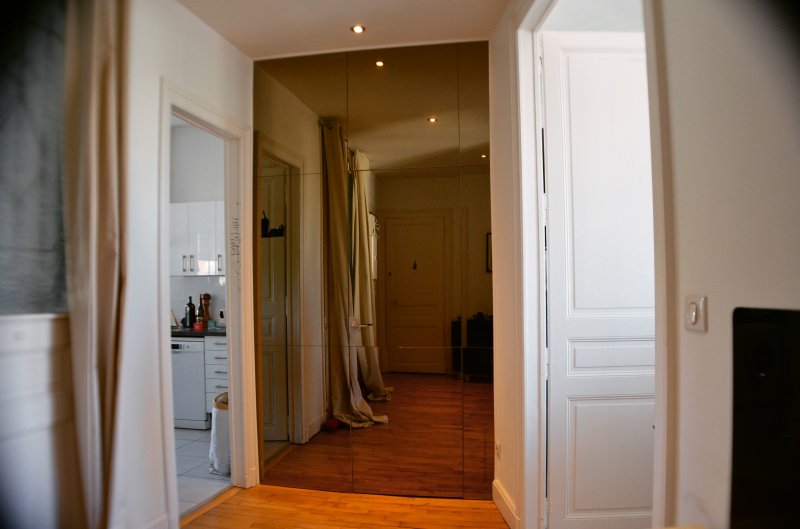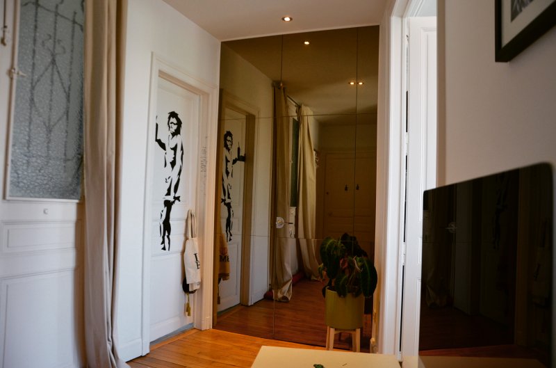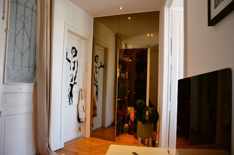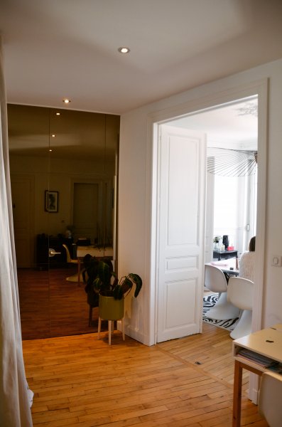 Le client souhaitait créer un espace de stockage "discret" pour son appartement de type Haussmannien tout en gardant du cachet. Nous avons créé cet espace de stockage derrière une cloison faite de miroirs teintés.