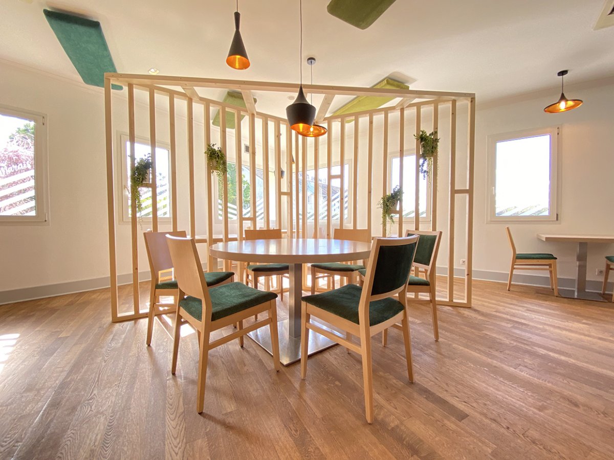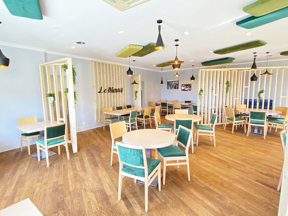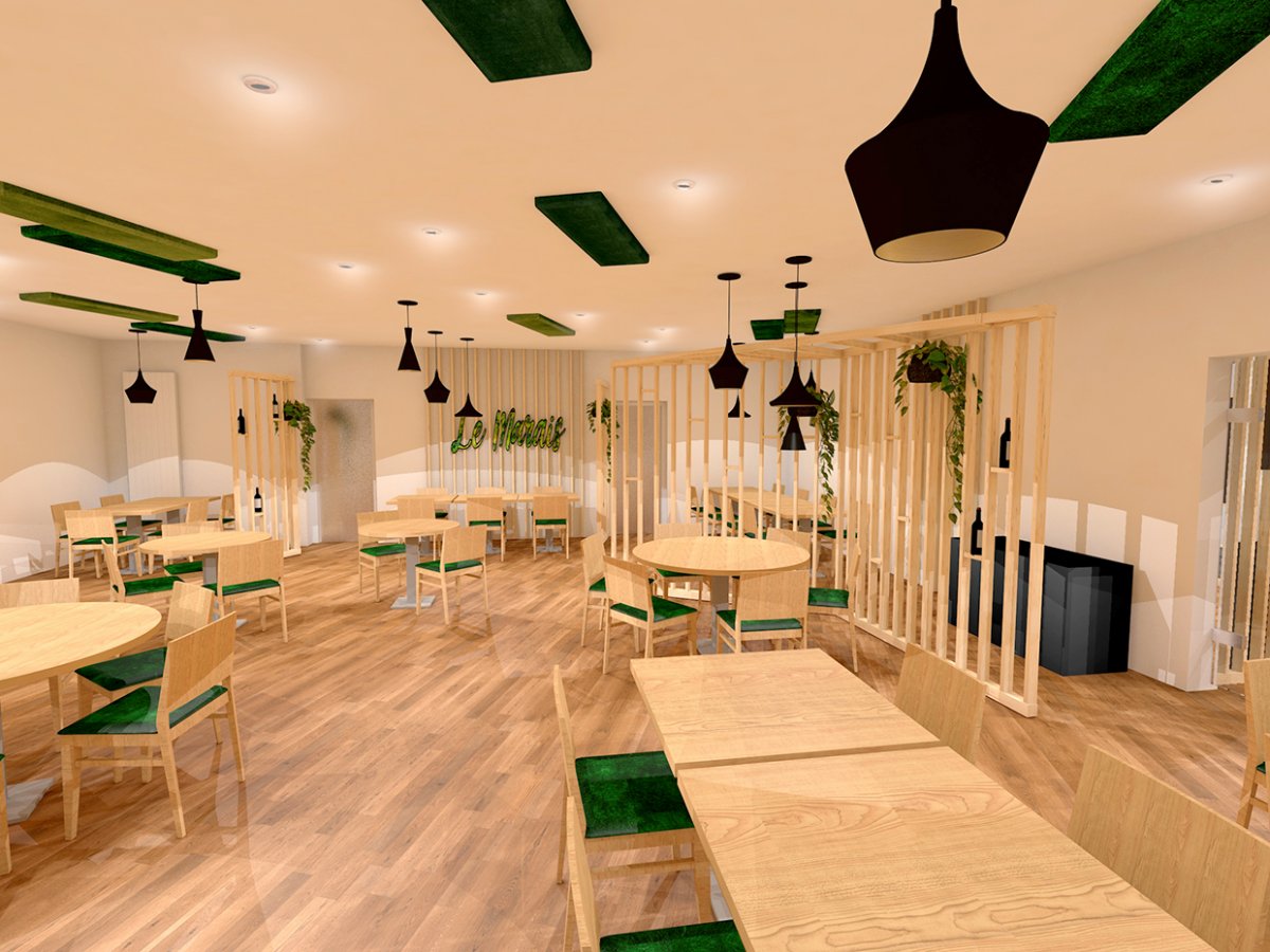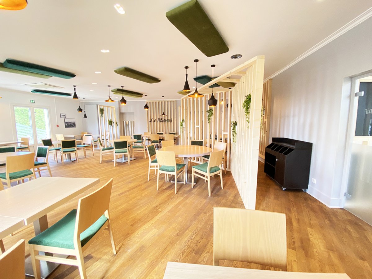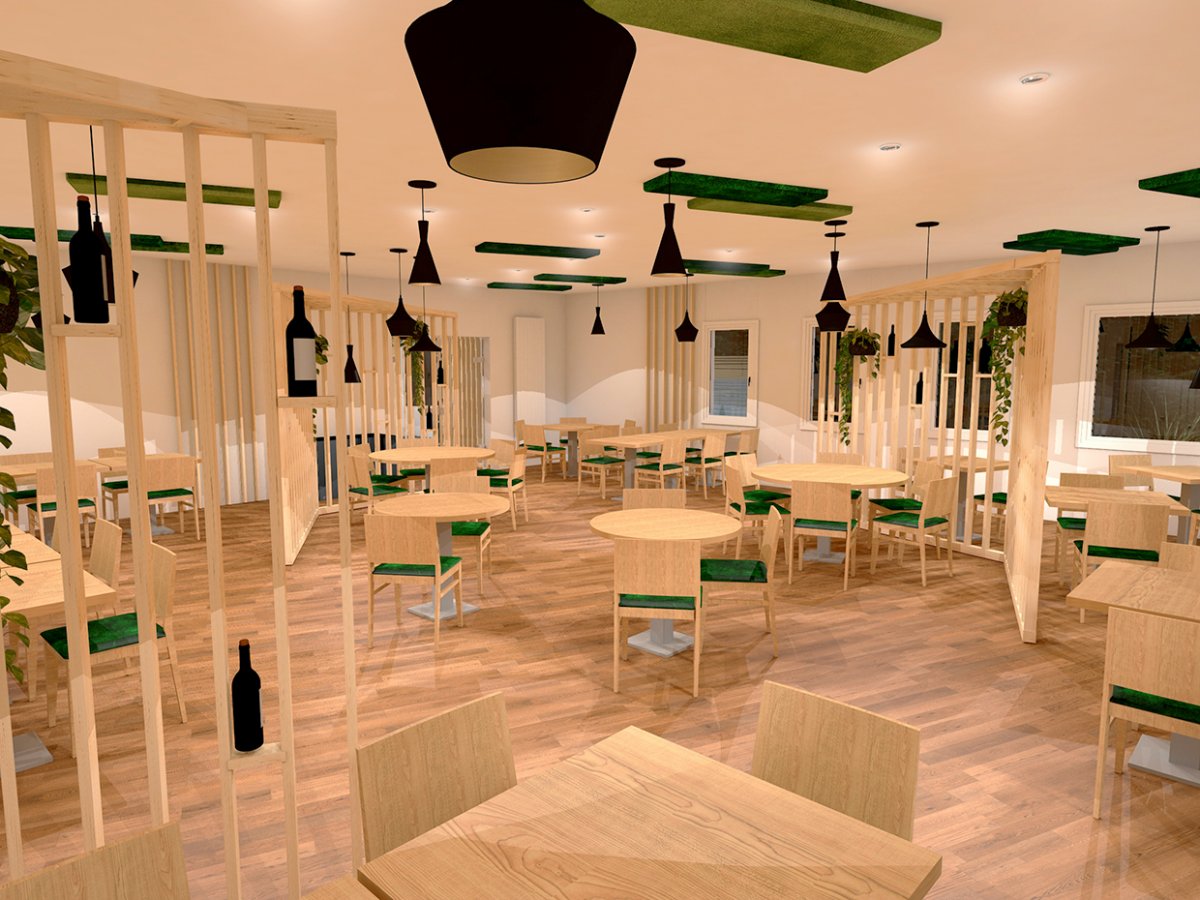 Aménagement et rénovation de la salle du restaurant d'un hôtel Kyriad. L'ancienne décoration étant impersonnelle nous avons homogénéisé la décoration sur une gastronomie biologique.